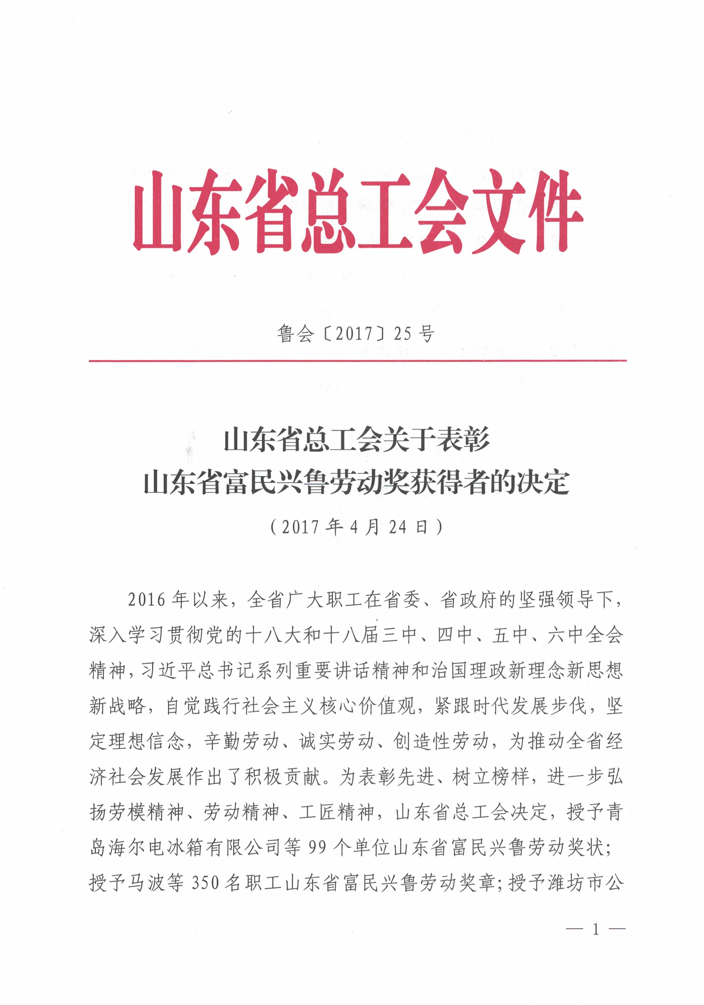 據(jù)了解,“富民興魯勞動(dòng)獎(jiǎng)狀”是山東省總工會(huì)組織評(píng)選的先進(jìn)集體獎(jiǎng)項(xiàng),旨在激發(fā)各單位自覺(jué)踐行社會(huì)主義核心價(jià)值觀,緊跟時(shí)代發(fā)展步伐,堅(jiān)定理想信念,辛勤勞動(dòng)、誠(chéng)實(shí)勞動(dòng)、創(chuàng)造性勞動(dòng),為推動(dòng)全省經(jīng)濟(jì)社會(huì)發(fā)展作出積極貢獻(xiàn),最終為實(shí)現(xiàn)“十三五”規(guī)劃目標(biāo)任務(wù)和全面建成小康社會(huì)建功立業(yè)。