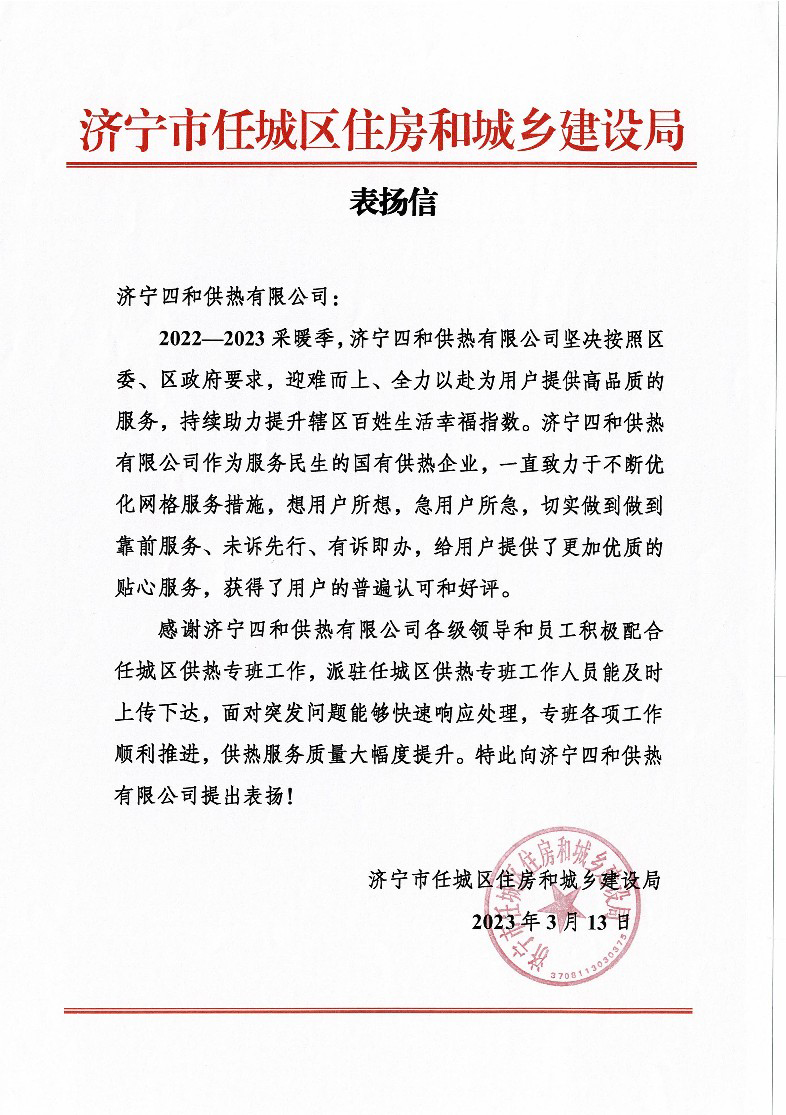 濟(jì)寧四和供熱有限公司受到濟(jì)寧市任城區(qū)住房和城鄉(xiāng)建設(shè)局通報(bào)表揚(yáng)